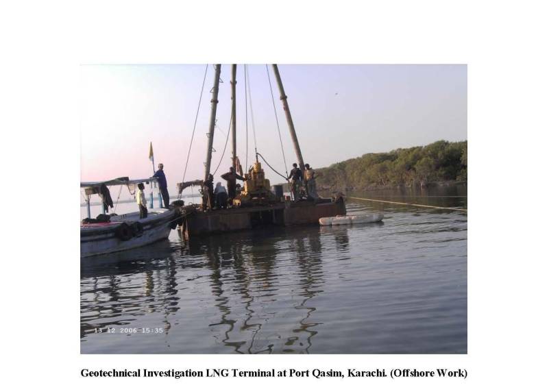 - 12 Boreholes of over 360m for LNG Terminal at Port Qasim, Karachi. Work involved 9 offshore boreholes in water depth up to 12m.